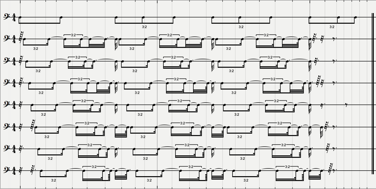 The piece will later be rendered using three different timbres. Each is linked to one social musical field. One minimal approach uses short micro-tonal bursts, one classical using piano sounds, and one house music using Roland’s and DX7’s sounds.