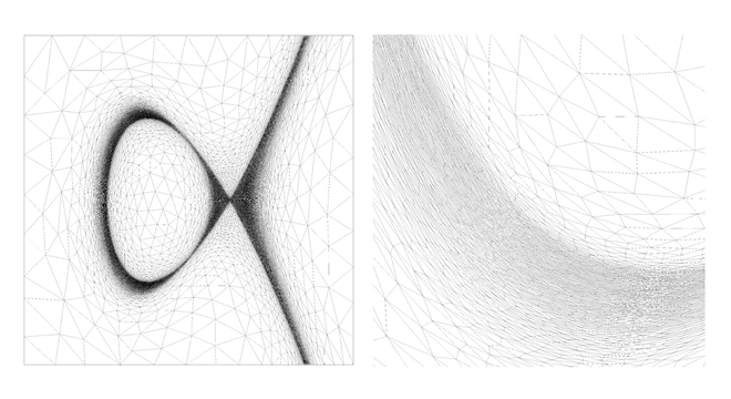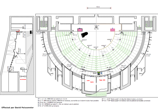 The voice and the piano are in the concert hall. Each note or sound event can be envelopped and placed in the space. A very special system is used: spatialization by envelope. Instead of being placed and moved in space, the sound source is sent to all the speakers and envelopes control the gain for each speaker. If these envelopes were periodic, we could say Low Frequency Oscillators are used. The opening for each speaker is rhythmically controlled. Each envelope can be affected or interpolated by its speaker affectation, its form, its attack, its duration, or its overlap with the other envelopes. This technique is very efficient if precisely synchronized with the acoustic instruments. For instance, a pizzicato in the middle of an orchestra could be reversed by an envelope and sent to a specific speaker. When envelopes are played fast, they start to be heard and can make a spacial granular synthesis. After years of using this technique, I found it very close to some architectural design tessellation techniques. This is the reason why I am using it for the audio part of my form projects.