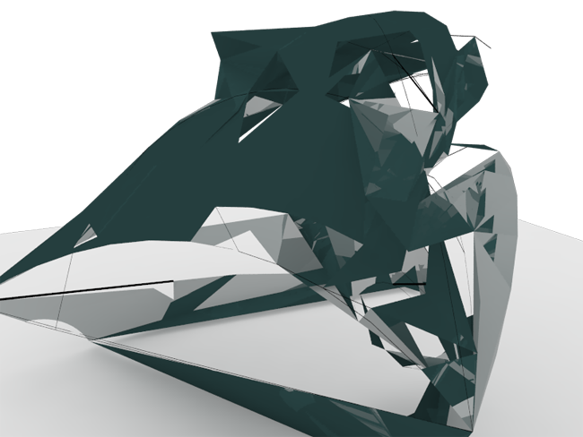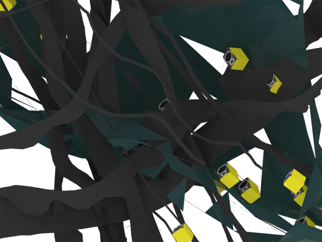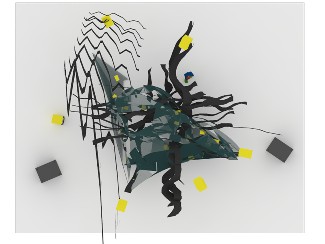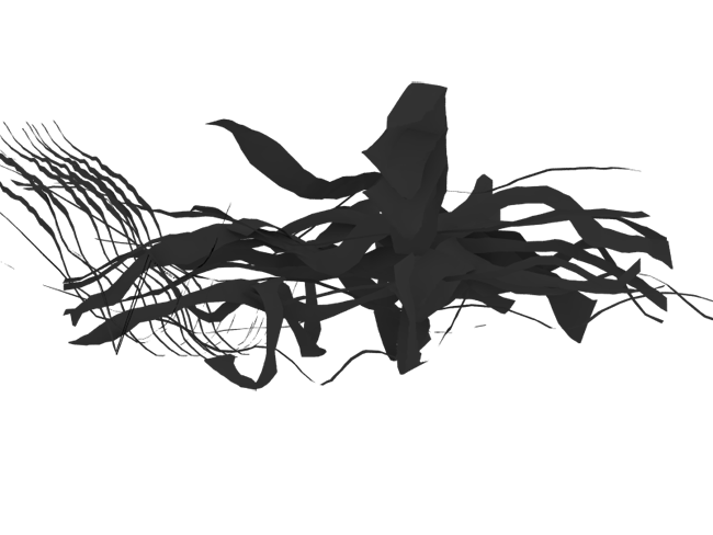 Spider webs stick on this structure and give liveness to the sculpture. The form from :) the web gives a pseudo-repetitive microstructure. The texture also becomes granular and evolute with the time since there will be more and more web on the brown part. The exhibition will end with a space invaded by webs until the sculpture itself “disappear”. Here we can talk about natural emergence using multi-agents; the spiders. To give an idea, cellular automata are also multi-agents.