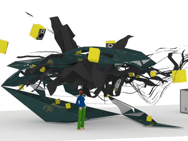 A big effort is made on a parametric composition because this is building the sound, the real structure, and their moving light reflections. A multichannel audio system diffuses 3d 3D-generated music made from the same emergence as spider multi-agents. Rules directly come from geometric information theories. A huge work of sound movements following the lightened web will be done in the same way I do in my usual productions. This time, it is going to be in the media art piece. As usual, the challenge is to make people understand the relation between what they see and what they hear. |