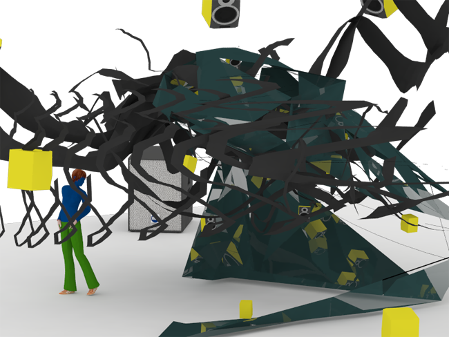 The small speakers are located in the structure; the big ones are around the space. People inside can hear precise sound movements from the small speakers. People located outside mostly hear sounds from the big speakers. It is then also possible to play with inter-relations between the inner and outer, big and small…