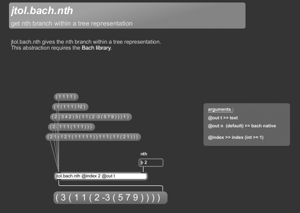 jtol.bach.decomposenoi and jtol.bach.redecomposenoi are gathering sub-trees for doing processes at one particular depth of tree. Same as jtol.bach.recompose but without index outlet.