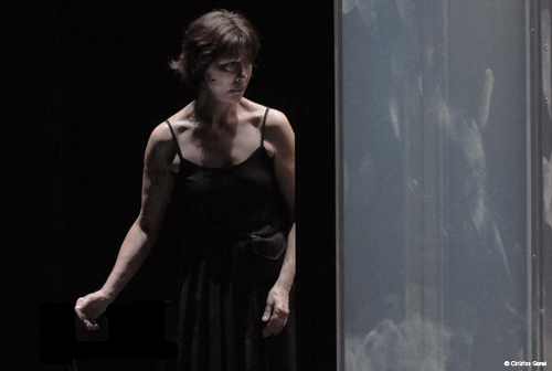 The concept of the stage is rather simple. It consists on a square of thin water in which both women walk. Two chairs and a large cube made of metal and glass reflect in this water floor. The bass singer is inside the box and never escapes from it. The two other musicians are outside the square. The accordionist is on the left side and the electronic musician in the hall with the sound engineer.