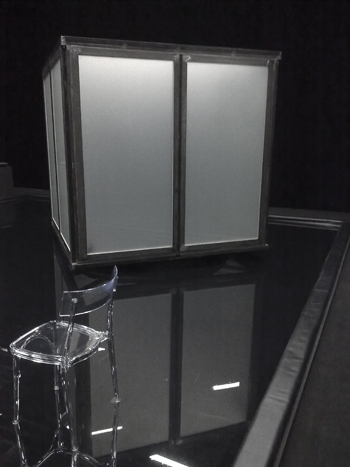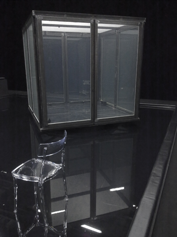 The box is a cage for the beast. This prison can change its opacity thanks to a special glasses. This system, which is called privalight, has been given by the Saint Gobain glass company. A polarized lcd layer changes the opacity with electricity. This way, it is possible to synchronize the opaqueness for each glass of the box with music. I made simple permutation effects in relation with the music, the live effects of voices and the dramaturgic needs.