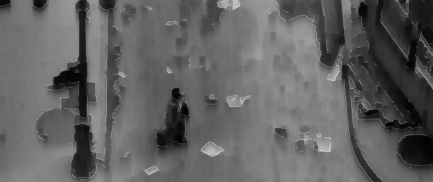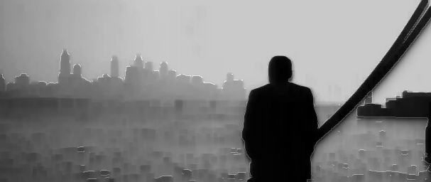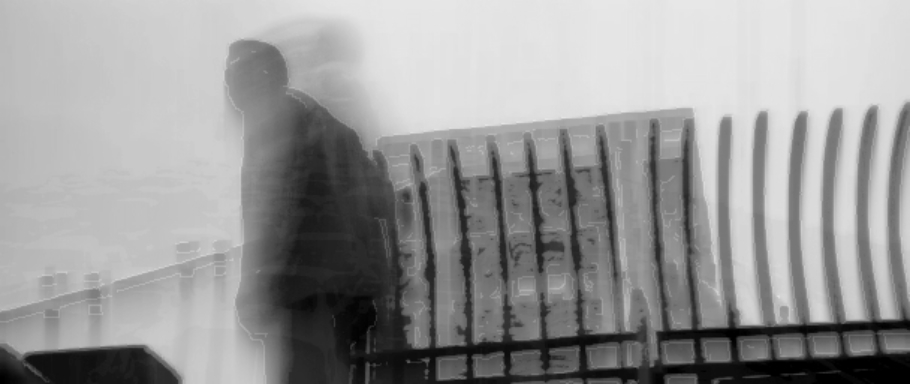 The movie and the sound consist of a well-chosen continuous filter effect. The result is a long and slow evolution of sound and moving images where time frames interlace one another. The work focuses on two main ideas: contour and time persistence.