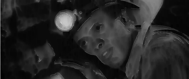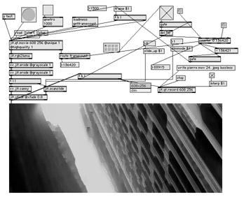 The visual contour I build is very similar but simpler than algorithms such as the VRay Toon Shader. I use MaxMSP Jitter for doing that. Many movies make use of this technique to generate cartoons from real film takes. The audio contour is quite similar since I am working in the spectral domain and simply looking for peaks. The mapping between the analysis and its re-synthesis (additive synthesis) is artistically empirical. It does not make use of mfcc or any other process after the spectral analysis for the sound or edge detection for the image. The result sometimes sounds very minimalist and “dronic” (drone). Sometimes, pure tones rhythmically arrive from the deepness of a long reverb. One could make connections with some “esthetic movement” close to Ryoji Ikeda works.