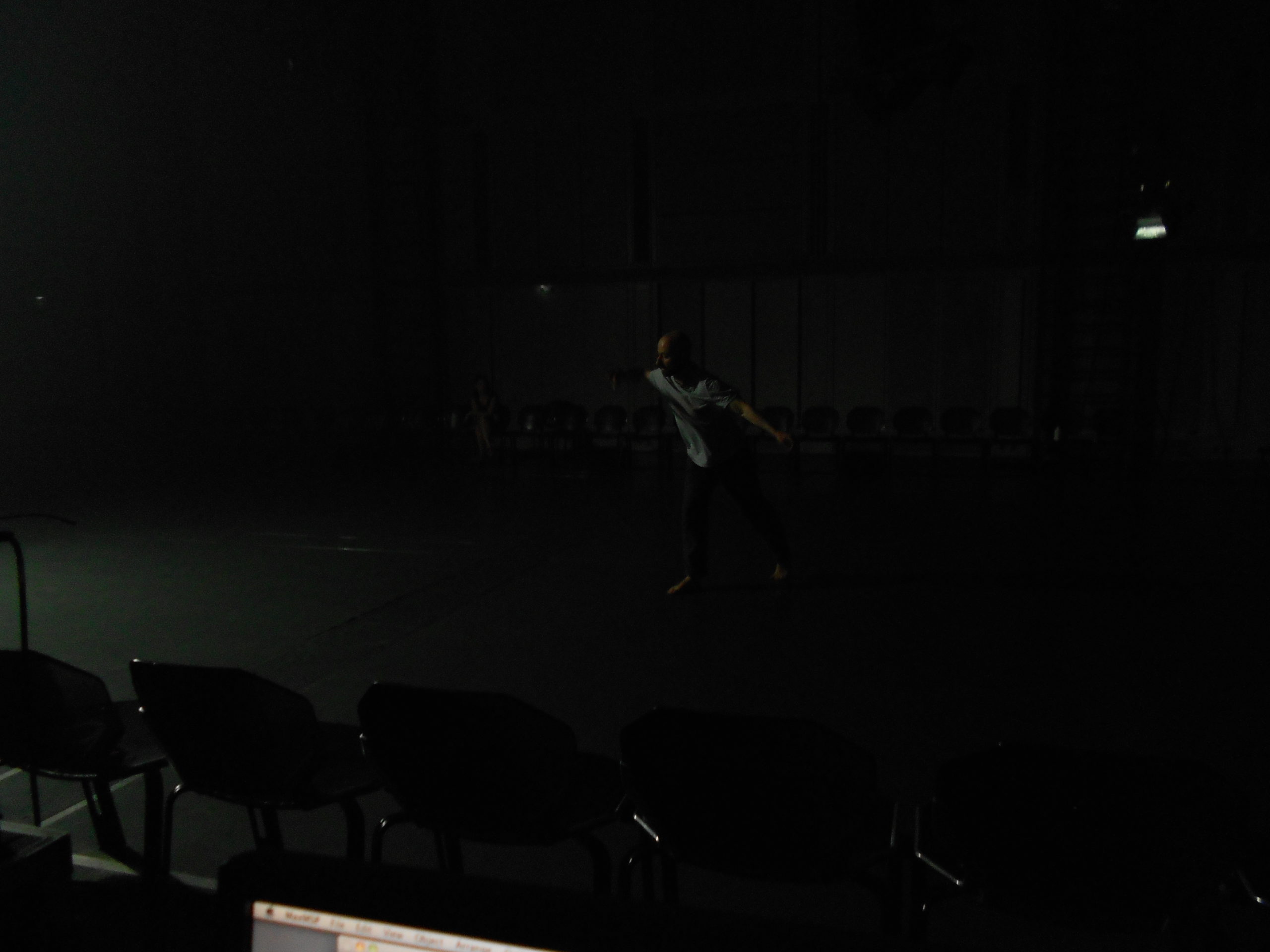 Both Ambisonic and WFS systems use relatively small speakers. The Ircam system is made of Amadeus speakers. The smaller they are, the closer they will be one from another, the most precise will be interferences, the flattest will be waves, and the most precise will be holophonic positions. Unfortunately, small sizes of speakers do not play basses. It is not a problem when only voices are played. Otherwise, sub-woofers (the least possible location feeling) are needed. For Night Light, I also collaborated with the excellent sound engineer Maxime Le Saux. He had the idea to add extra D&B speakers and subs in a peculiar way. Two huge grapes of speakers are added in the center of the hall; in the center of the Ambisonic sphere. Each speaker is directed toward a different direction in order to use various directivities and reflections from the walls. When sounds are alternatively sent to each speaker very quickly, the audience hears radical changes in space. The setup is visually impressive. Also, the placement of listeners does not matter because they hear something completely different according to their seat. Seats are placed along Espro’s walls and dancer Alban Richard can play in the center of the hall. This is not the optimal disposition for Ambisonic but it is a compromise taking dance and light into account. Alban’s place is basically the best one but that does not really matter if seat position is not a unique question. In Espro, the Ambisonic speaker sphere needs to be a little too high from the floor. This allows everybody to hear all speakers wherever they are seated. This is not convenient for Night Light because the audience is sitting on chairs on the floor. So extra speakers are added under the seats bringing down the sonic space toward the floor where the dance is happening. This is also a good opportunity to do panning spatialization on the floor following Alban Richard’s displacements.