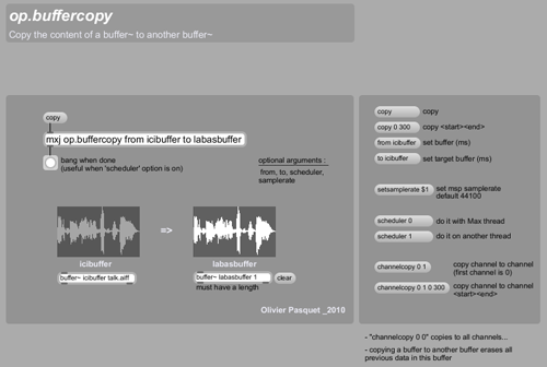 op.buffercopy is a Max external that copies a buffer~ to another buffer~ entirely or channel by channel. It can be done on another thread in case its size is large.