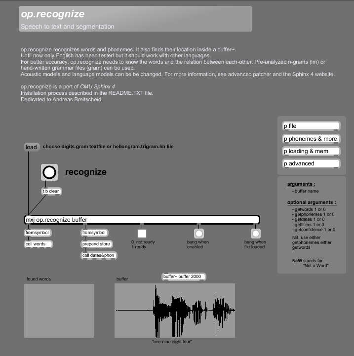 op.recognize is a speech recognition external (speech to text) based on the Sphinx library. It translates the incoming signal into text and gives time positions of phonemes and recognized words recorded into a buffer~. No specific voice learning is needed.