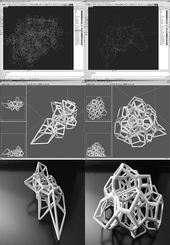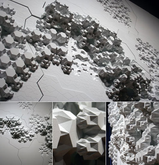 The question of perspective is a starting point for many generative processes in architectural design and “modern” composition. This is not only a historical question, it is also a question of perception. Edges of perception either musical or material are often joined by points. Those points can be notes, visual edges in an image, real obstacles, measures, etc… The interconnection between those edges can eventually be marked out with what makes the intersection between two non-parallel strait lines: dots. The perceived position of these points differs from the situation of the viewer. Forced perspective is one of the many techniques controlling spacial perspectives. Why not use such distortions with the time dimension? After distorting all spatial dimensions and time, there is a next step. It is also possible to play with discrete spaces and times: scales and dates. A particular process is done at a specific date and place. Spacial and time distortions would then be the result of the order and length of processes themselves. This concept is widely used in nanotechnologies and almost all multi-agent systems (see my Sound Agent project). Architects Aranda & Lasch demonstrate this with their art piece Rule of six. With Kaspar I also show something similar playing with scale relativity theory. Generative rules change depending on the observed scale, the point of view, and time. Conceptual connections are made between one rule and another. Astrophysicist Laurent Nottale wrote an interesting paper about this.