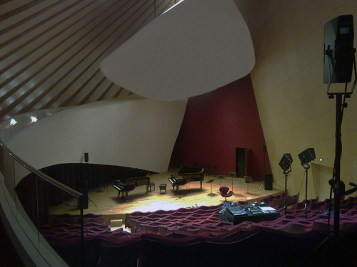 The voice and the piano are in the concert hall. Each note or sound event can be enveloped and placed in the space. A very special system is used: spatialization by enveloppe. Instead of being placed and moved in space, the sound source is sent to all the speakers, and envelopes control the gain for each speaker. If these envelopes were periodic, we could say Low-Frequency Oscillators are used. The opening for each speaker is rhythmically controlled. Each envelope can be affected or interpolated by its speaker affectation, its form, its attack, its duration, or its overlap with the other envelopes. This technique is very efficient if precisely synchronized with the acoustic instruments. For instance, a pizzicato in the middle of an orchestra could be reversed by an envelope and sent to a specific speaker. When envelopes are played fast, they start to be heard and can make a spatial granular synthesis. After years of using this technique, I found it very close to some architectural design tessellation techniques. This is the reason why I am using it for the audio part of my form projects.