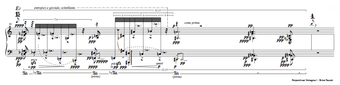 The importance of perspective affects many areas of Perspectivæ Sintagma I: the consubstantial prospect to the canon, of course, but also the possible prospect between the writing and the interpretation. During the execution of the piece, the pianist is constantly compared to the ideal score, geometric, stored in the computer. The tiny gaps between the interpreter and the actual partition are inserted in real-time into a compositional algorithm. This system replicates the same synthesis process as it is in the written score. In a sense Perspectivæ Sintagma I is the true subject of canons, whether written, interpreted, or re-evaluated while being played.