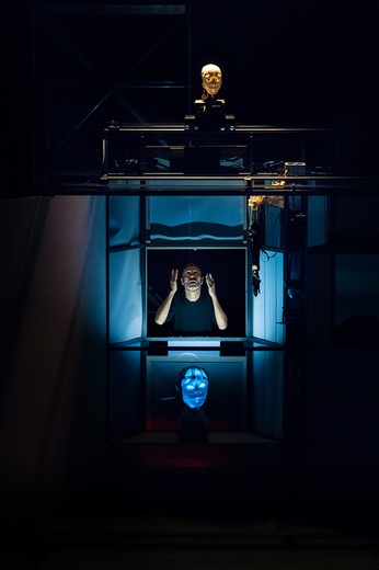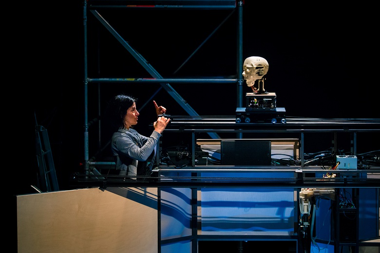 Olivier Pasquet: Machinations was his first project with IRCAM. I suppose then that the subject of the relation between man and machine appeared naturally. Eighteen years later, as the plays progressed, Georges made as much progress in his artistic research as the company’s relationship to technology. The two have merged to the point that we do not really talk about relationships but integration at a societal level rather than just organological. The microprocessor is no longer defined simply as a universal machine that moves and transforms information and matter. We decided to integrate it into our thoughts, actions, and gestures – sometimes as a regulator. Here, George goes a step further and talks about the human assimilation of the tool, which becomes an extension of the members. In the show, this mechanics becomes automatic and autonomous. In my opinion, this is why the stage and musical work of the piece mixes the bodies and voices of the singers with robots. The confrontation between the machine and the human of Machinations has been transposed.