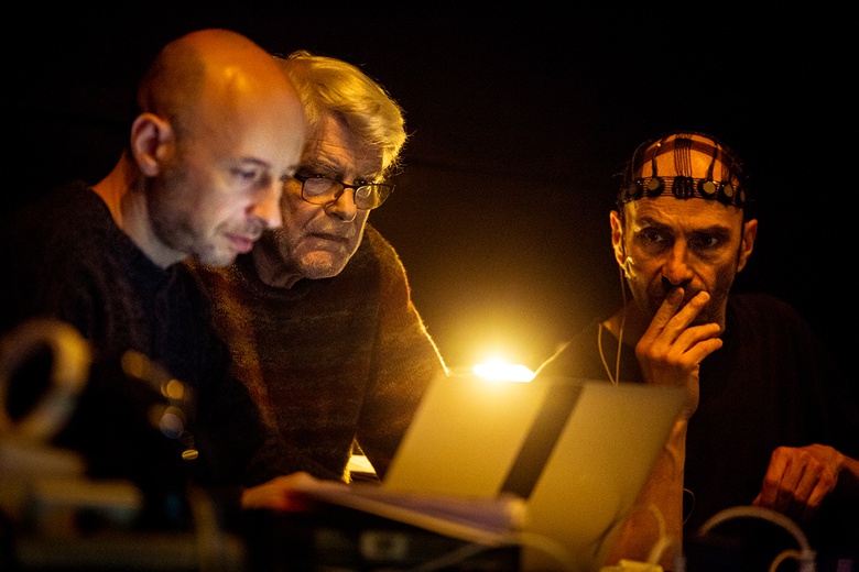 La pièce n’utilise pas « réellement » d’intelligence artificielle. Georges a écrit quelques parties de la pièce avant les répétitions. Un tel déterminisme n’a nul besoin d’une telle approche dynamique en amont ou dans le temps réel cette performance. Si on considère l’intelligence artificielle comme un outil, les questions de son utilisation dans un spectacle es sont exactement les mêmes que pour le temps-réel. Pour donner un exemple concret : généraliser ou rendre autonome un processus compositionnel pour une pièce traditionnellement lue de façon linéaire par le public aurait-il un sens ? Je pense que oui, du point de vue du compositeur. Le choix d’une échelle de contrôle, des diverses synchronicités et du déterminisme formel sont pour lui des questions cruciales, qui sont profondément liées à des choix culturels et esthétiques. Nous avons donc affaire à une intelligence tout court ; une machine ambiguë faite de diverses natures dans d’autres natures ; d’un corpuscule dont on comprend au fil du temps de la pièce qu’il n’est qu’un système.