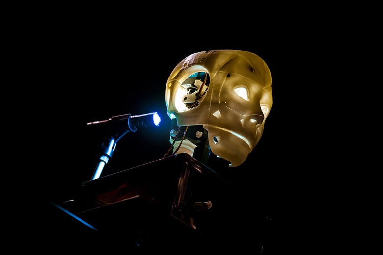 Olivier Pasquet : Machinations était son premier projet avec l’Ircam. Je suppose donc que le sujet du rapport entre l’homme et la machine est apparu naturellement. Dix-huit années plus tard, au fil des pièces, Georges a autant avancé dans sa recherche artistique que le rapport de la société à la technologie. Les deux se sont fondus au point qu’on ne parle plus vraiment de rapport mais d’intégration à un niveau sociétal plutôt qu’uniquement organologique. Le microprocesseur ne se définit plus uniquement comme une machine universelle qui déplace et transforme de l’information, de la matière. On a décidé de l’intégrer dans nos pensées, faits et gestes — parfois comme un régulateur. Ici, Georges va un cran plus loin et parle de l’assimilation humaine de l’outil, qui devient littéralement une extension des membres. Dans le spectacle, cette mécanique devient automatique et autonome. C’est selon moi la raison pour laquelle le travail scénique et musical de la pièce mélange les corps et voix des chanteurs avec des robots. La confrontation entre la machine et l’humain de Machinations a été transposée.
