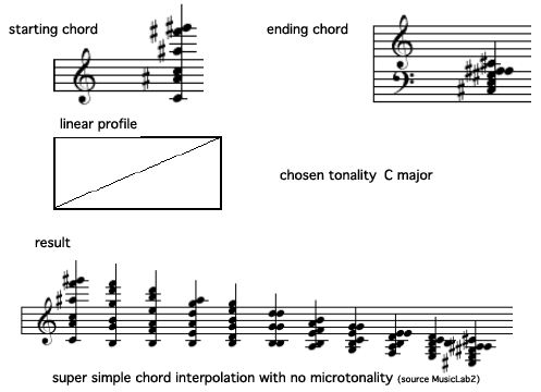The concept of the system is quite simple and effective. It is based on harmonic linear and non-linear distortions. Melodies and chords are vertically stretched and reversed. A central note could become the center of homothecy, the center of reversing or point of a stretch change. A special moment, like a cluster, could be a date for a drastic change in the pitch relations. This twisting technique has widely been used. It becomes musically interesting when the starting material has a clear logic. It is even fun to experiment with a well-known and recognizable component. For instance, the harmonic logic can sometimes be easily understood with tonal music. Using Debussy or Brahms extracts or re-arrangements from them as starting point raises many interesting questions about the necessity for simple music, the necessity for tonal music, copyrights and even about sampling excerpts. Those questions can be wiped out if the composer chooses not to clearly show where it is coming from. But it is more fun to at least show it once in a time.